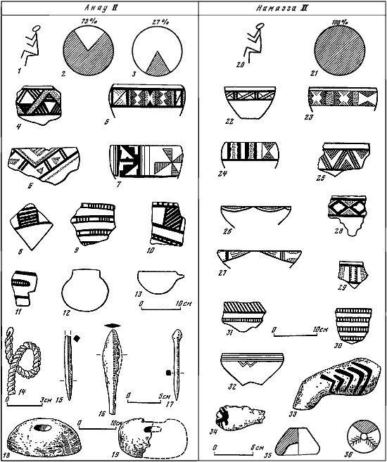 Таблица XV. Среднеэнеолитические комплексы Анау (1-19) и Намазгадепе (20–36).