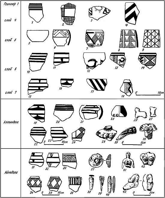Таблица XVI. Среднеэнеолитические комплексы Геоксюра 1 (1-18), Алтындепе (19–30) и Айнадепе (31–43).