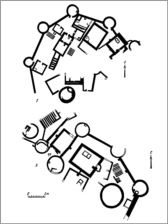 Таблица XVII. Планы поселений Муллалидепе (1) и Ялангачдепе (2).