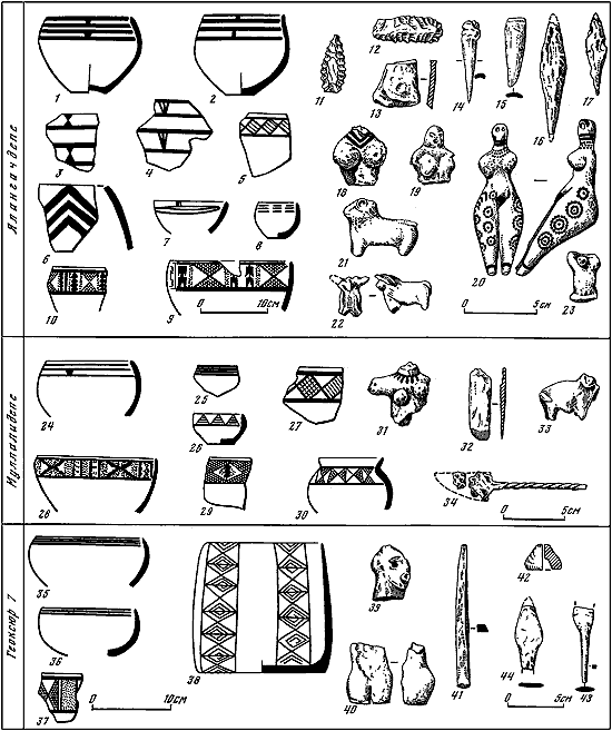 1-10, 24–30, 35–38 – керамика; 11, 12 – кремневые изделия; 13, 16, 17, 34, 41, 43, 44 – металлические изделия; 14, 15 – костяные изделия; 18–23, 31, 33, 39, 40 – глиняные необожженные и терракотовые статуэтки; 32 – каменное изделие; 42 – терракотовое пряслице.