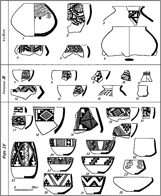 Таблица XIX. Позднеэнеолитическая керамика Акдепе (1–6), Намазгадепе (7-15) и слоя Кара 1Б поселения Карадепе (16–32).