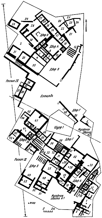 Таблица XX. План строений Карадепе периода позднего энеолита на уровне одного строительного горизонта.