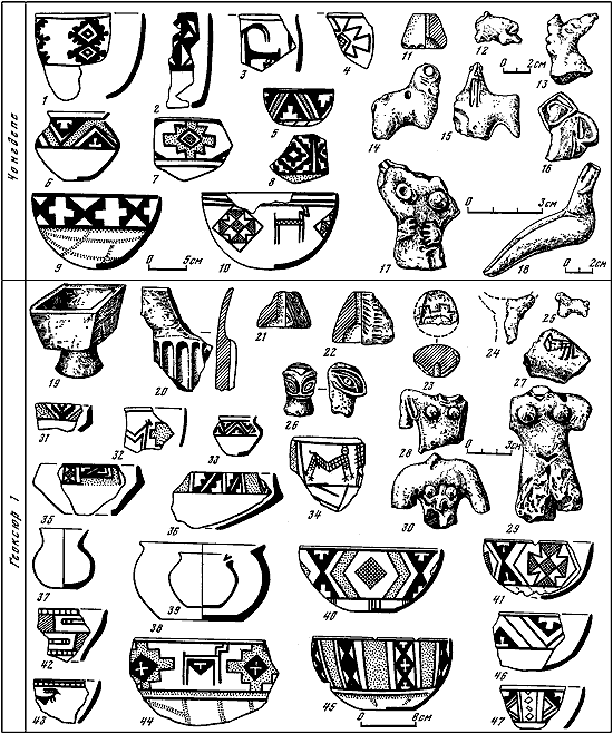 1-10, 31–47 – керамика; 11, 21–23 – терракотовые пряслица и навершие; 12–18, 24–30 – терракотовые статуэтки; 19–20 – каменные сосуды.