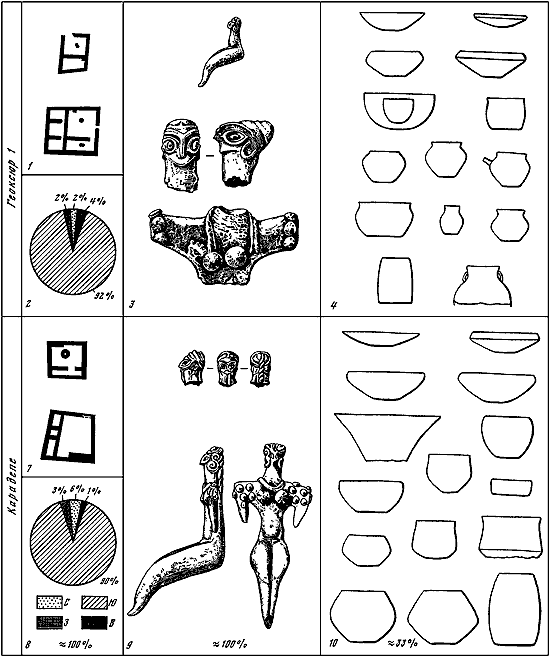 Таким образом, энеолитические племена Средней Азии выступают перед нами как общество, где наряду с культом женского божества – покровительницы плодородия – определенную роль играли и представления тотемического круга, вероятно, уже подчиненные этому главному культу. Недаром фигурки козлов изредка рисуются на бедрах женских терракот. Весьма интересно наличие в культовом комплексе Карадепе двух расположенных рядом и одинаковых по размерам подквадратных в плане помещений, которые, судя по ялангачским аналогиям, можно трактовать как святилища. Если одно из них было посвящено культам плодородия, т. е. в первую очередь женскому божеству, то естественно предположить связь второго святилища с мужским божеством, составлявшим с древней покровительницей земледельцев священную пару. Не исключено, что с таким мужским божеством был связан и культ быка, терракотовые и каменные изображения которого как раз появляются на Карадепе в это время. Во всяком случае, в культовом комплексе Алтындепе, относящемся уже к средней бронзе, небесный бык выступает в совокупности с мужским лунным божеством (Массон В.М., 1974б).