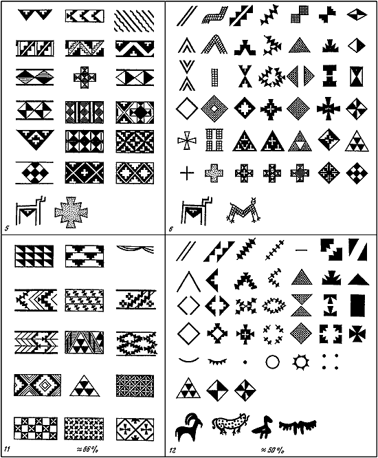 Искусство энеолитических земледельцев тесно связано с их идеологическими представлениями, с развитием общественной жизни, хозяйственным потенциалом и производственными возможностями древних общин (Массон В.М., 1966а; Сарианиди В.И., 1967; Сарианиди В.И., Кошеленко Г.А., 1966; Массон В.М., Сарианиди В.И., 1972). Определенную роль играло и стремление благоустроить, украсить быт. Так, уже в пору раннего энеолита с повышением роли общины как представителя коллективного труда или простой первобытной кооперации все большее значение приобретает создание на поселениях центров, воплощающих идеологическое единство. В архитектурном плане эта задача решается на основе рядового жилого дома со специфическим оформлением интерьера. Как показывают раскопки ряда памятников, особое внимание при этом уделялось росписи стен, покрывавшихся композициями из геометрических фигур. Иногда, видимо, роспись представляла собой простой перенос на стену орнамента цветной циновки. Такова стенная роспись северного холма Анау, образующая двусторонние композиции типов 18 и 20, характерные и для расписной керамики среднеазиатского энеолита. В качестве основного строительного материала использовался прямоугольный сырцовый кирпич, на размерах (длинная сторона равна 48–50 см) которого, возможно, и основывался архитектурный модуль.