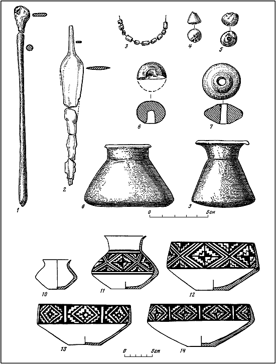 1, 2 – металлические изделия; 3 – бусы из бирюзы; 4–7 – каменные и терракотовые изделия; 8–9 – каменные сосуды; 10–14 – керамика.