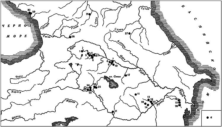 1 – Арухло I–III; 2 – Дангреулигора; 3 – Шулаверисгора; 4 – Гадачрилигора; 5 – Имирисгора; 6 – Храмис Дидигора; 7 – Бабадервиш; 8 – Шомутепе; 9 – Тойретепе; 10 – Гаргалартепеси; 11 – Иланлытепе; 12–16 – поселения Мильской степи; 17 – Кечили; 18 – Аликемектепеси; 19 – Гурудере I–VI; 20 – Мишарчайские поселения; 21 – Нахичеванский Кюльтепе I; 22 – Маштоцблур; 23 – Шенгавит; 24 – Техут; 25 – Хатунарх; 26 – Адаблур; 27 – Гинчи; 28 – Тетрамица; 29 – Мачарское поселение; 30 – Гуад-Иху; 31 – Нальчикский могильник.