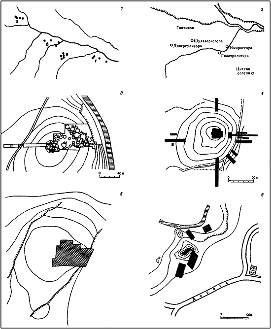 1 – расположение раннеземледельческих поселений в Квемо-Картлийской долине по А.И. Джавахишвили (а – группа Арухло; б – шулаверская группа; в – группа Цители сопели; г – группа Качагани); 2 – расположение поселений в шулаверской группе; 3 – план Имирисгора; 4 – план Арухло I; 5 – план Шулаверисгора; 6 – план Нахичеванского Кюльтепе I.