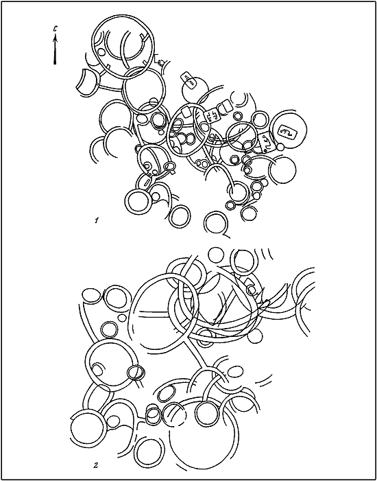 1 – общий план раскопа; 2 – план юго-восточной части раскопа (нижние горизонты).
