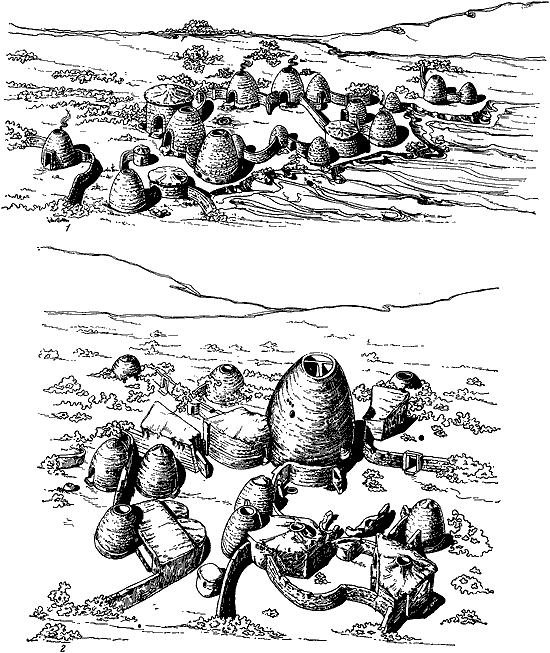 Таблица XXIX. Реконструкция раскопанных участков поселений Шомутепе (1) и Иланлытепе (2) по Д.Н. Ахундову.