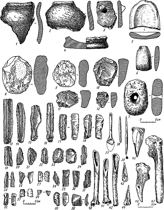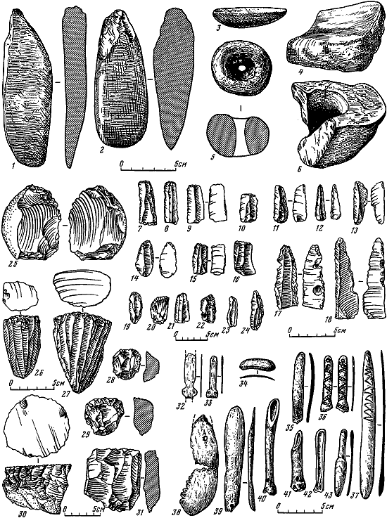 1–6 – каменные орудия; 7-31 – кремневые и обсидиановые изделия; 32–43 – костяные изделия.