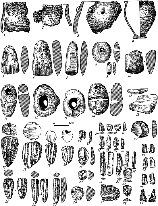 1–4 – керамика; 5–7 – каменные изделия; 8-36 – кремневые и обсидиановые изделия; 37–47 – костяные и роговые предметы.