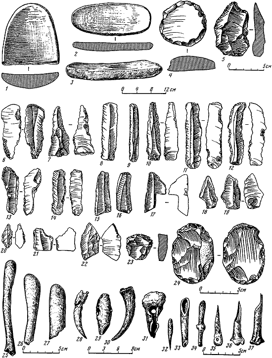 1–3 – каменные изделия; 4-24 – изделия из кремня и обсидиана; 25–37 – изделия из кости и рога.