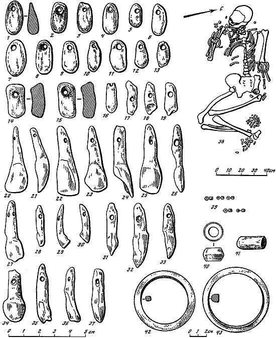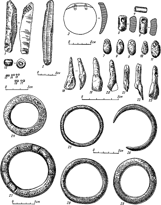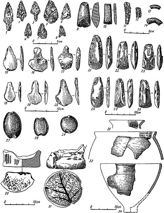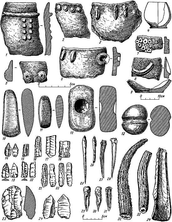 1–9 – керамика; 10–13 – каменные изделия; 14–24 – обсидиановые изделия; 25–31 – костяные изделия; 32–34 – изделия из рога.