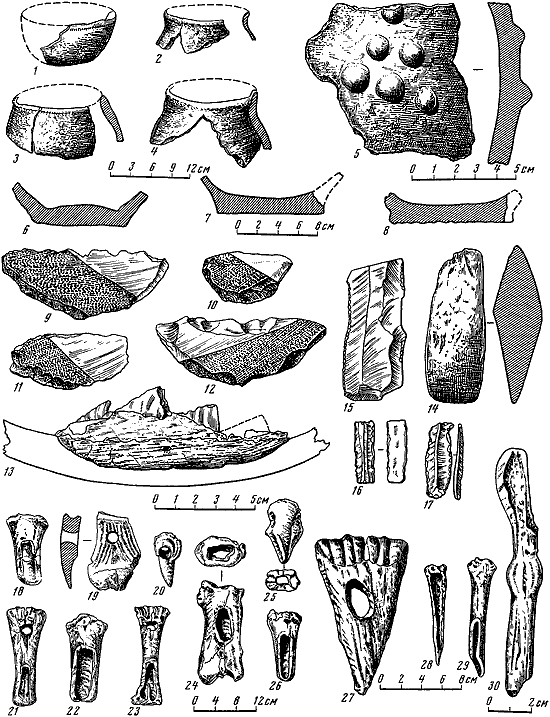 1–8 – керамика; 9-12 – вкладыши серпов; 18 – остатки серпа; 14 – каменный топор; 15–17 – обсидиановые изделия; 18–30 – костяные и роговые изделия.