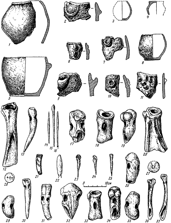1-11 – керамика; 12–37 – изделия из кости и рога.