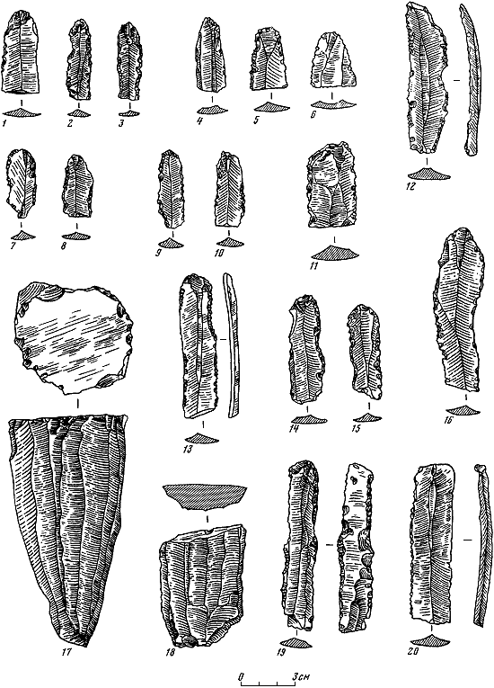 Таблица XLI. Нахичеванский Кюльтепе I. Орудия из обсидиана (1-20).