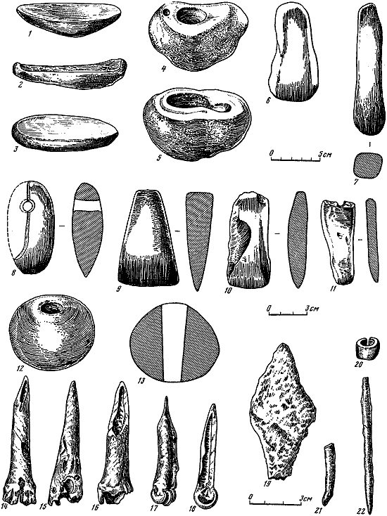 Таблица XLII. Нахичеванский Кюльтепе I. Изделия из камня (1-13), кости (14–18) и металла (19–22).