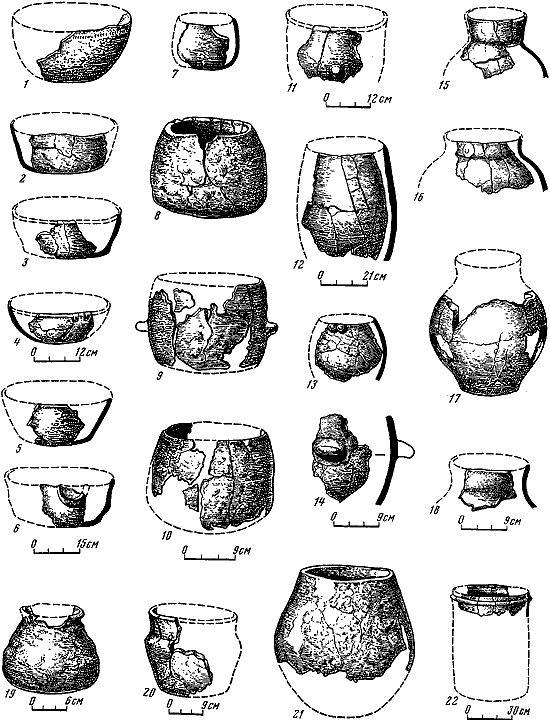 Таблица XLIII. Нахичеванский Кюльтепе I. Керамика (1-22).