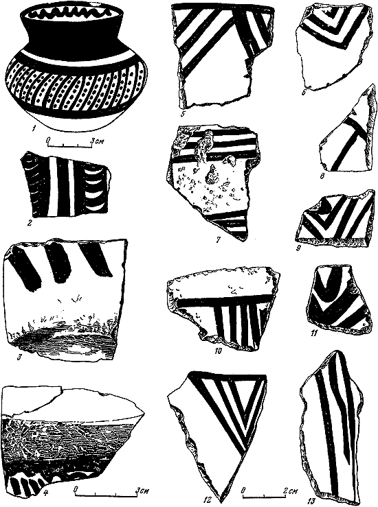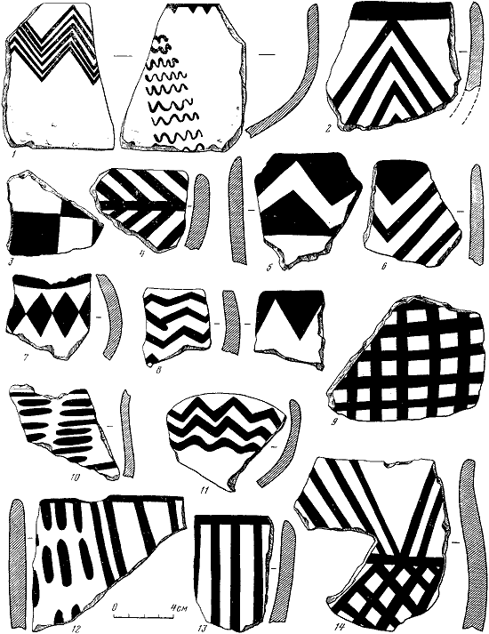 Таблица XLIV. Расписная керамика Нахичеванского Кюльтепе I (1–4) и поселений Мильской степи (5-13).