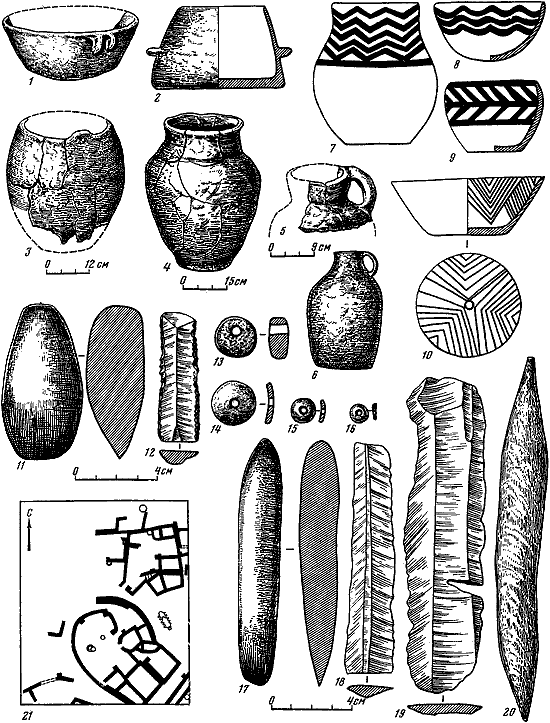1-10 – керамика; 11 – каменный топор; 12 – кремневый вкладыш серпа; 13 – каменная бусина; 14–16 – раковинные украшения; 17 – каменный нож; 18, 19 – обсидиановые ножи; 20 – костяное орудие; 21 – план раскопа на уровне строительного горизонта 2.