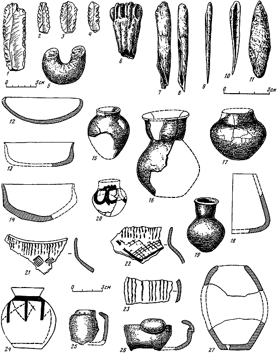 1–4 – кремневые и обсидиановые изделия; 5 – обломок каменного грузила; 6-10 – изделия из кости; 11 – металлический нож; 12–27 – керамика.