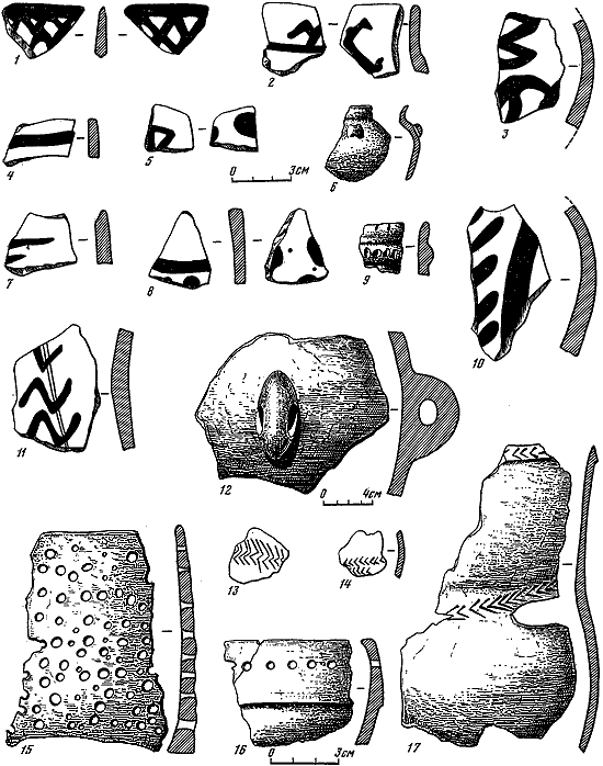 Таблица XLIX. Керамика Гинчинского поселения (1-17).
