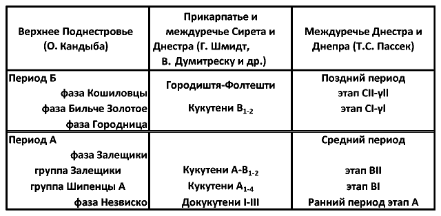 Для территории СССР наблюдения, сделанные в 50-е и 60-е годы, не оставляли сомнений относительно верности периодизации Т.С. Пассек основных этапов развития трипольской культуры, но на очереди уже стоял вопрос о создании более дробной периодизации, необходимой для определения в пределах соответствующего этапа возраста многих вновь открытых поселений. Над уточнением периодизации работали С.Н. Бибиков (1955а; 1966б), Н.М. Виноградова (1972; 1974), В.Н. Даниленко (1969; 1974), Ю.Н. Захарук (1955; 1962; 1964), И.И. Заец (1975б), В.Г. Збенович (1972; 1974; 1976а; 1976б), В.П. Кравец (1955), В.А. Круц (1977), В.И. Маркевич (1973а; 1981), Т.Г. Мовша (1971а; 1971б; 1972), Т.С. Пассек (1961а; 1964; 1965а); Е.В. Цвек (1975), Е.К. Черныш (1975а; 1976), Н.М. Шмаглий (1961; 1966). Таким образом, для памятников трипольско-кукутенской культурной общности было создано несколько схем периодизации. Каждая из них возникла в результате исследования памятников определенного региона, и вместе с тем каждая отразила основную линию эволюции культуры Триполье-Кукутени в целом, бесспорным свидетельством чего является полное совпадение основных этапов при сравнении всех трех схем периодизации (табл. 8).