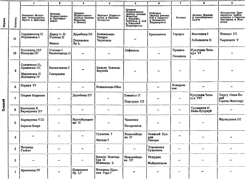Особенности инвентаря раннетрипольских и докукутенских поселений позволяют разделить их на два этапа и шесть ступеней (табл. LII). Из них три ступени (1–3) относятся к первой половине раннего периода (Докукутени I, II) и три (4–6) – ко второй (этап А – по периодизации Т.С. Пассек, Докукутени III – по периодизации румынских археологов). Поселений второй половины раннего периода известно втрое больше (карта 3, в), чем поселений первой половины. Однако на территории от Восточных Карпат до Южного Буга обнаружены только два стратифицированных памятника со слоями и первой, и второй половины раннего периода – Извоаре и Тырпешти. Вместе с соседними поселениями Фрумушика, Калу, Траян-Дялул Вией и Траян-Дялул Фынтынилор они образуют на Бистрице компактную группу многослойных поселений, позволяющих создать надежную хронологическую колонку кукутенских и докукутенских памятников Молдавского Прикарпатья (табл. 9). В Извоаре и Тырпешти слои относятся к фазам Докукутени II, Докукутени III, Кукутени A1-А2 и к последней фазе позднего периода, называемой Городиштя (Vulpe R., 1957; Marinescu-Bîlcu S., 1974с). Соотношение нижних слоев Извоаре и Тырпешти свидетельствует о том, что памятники с керамикой, сплошь покрытой защипами или резным узором, являются наиболее древними среди докукутенско-трипольских поселений, т. е. относятся к первой половине раннего периода (Докукутени I, II – Триполье АI), а памятники с керамикой, имеющей проглаженный орнамент, – ко второй половине того же периода (Докукутени III – Триполье АII).