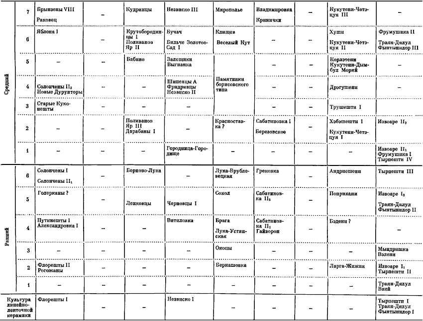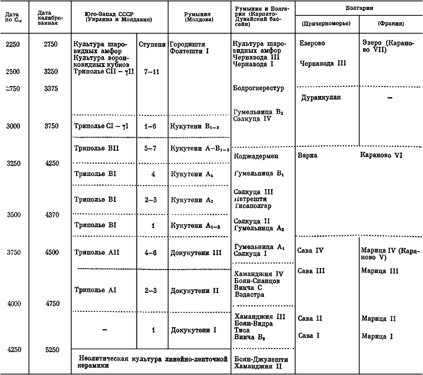 Благодаря разнообразному импорту и необычайно длительному (около 1500 лет) периоду существования культура Триполье-Кукутени заняла центральное положение в системе периодизации энеолитических культур Юго-Восточной Европы, что наглядно демонстрирует таблица 10 (табл. 10), составленная на основе разработок В. Думитреску и Г. Тодоровой (Dumitrescu V., 1968а; 1974b; Тодорова X., 1979). Истоки этой культуры пока еще недостаточно ясны. В ее ранних памятниках исследователи усматривают пережитки поздненеолитических культур Карпато-Дунайского бассейна и находят черты, сближающие ее с нижнедунайскими и восточнотрансильванскими культурами (Боян, Турдаш, Хаманджия). Однако вопрос о происхождении культуры Триполье-Кукутени с территории Нижнего Подунавья или Трансильвании остается пока дискуссионным. Единая по своему происхождению рассматриваемая культура в процессе развития обрела множество самостоятельных вариантов, закончивших существование приблизительно одновременно, когда на смену им пришли скотоводческие культуры раннебронзового века.