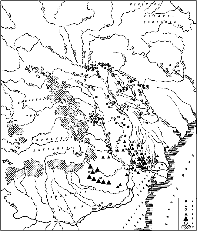 1 – Брага; 2 – Сокол; 3 – Лука-Врублевецкая; 4 – Берново-Лука; 5 – Ленковцы; 6 – Бернашовка; 7 – Витиловка; 8 – Путинешты I; 9 – Александровка I; 10 – Флорешты I–II, Рогожаны I; 11 – Тырпешти I–III; 12 – Андриешени; 13 – Извоаре I; 14 – Трудешти (Гигоешти); 15 – Влэдени; 16 – Ларга-Жижия; 17 – Калу; 18 – Борлешти; 19 – Траян-Дялул Вией; 20 – Траян-Дялул Фынтынилор II; 21 – Тыргу Негрешти; 22 – Кетриш I; 23 – Реча V; 24 – Солончены I; 25 – Солончены II1; 26 – Гайворон; 27 – Сабатиновка II; 28 – Могильное III; 29 – Греновка; 30 – Саврань; 31 – Голерканы; 32 – Новые Русешты I1б; 33 – Карбуна; 34 – Мындришка; 35 – Банку; 36 – Эрестегин; 37 – Алдени; 38 – Джулешти; 39 – Спанцов; 40 – Брэилица; 41 – Дрэгэнешти (Текуч); 42 – Стойкани; 43 – Кокора; 44 – Лопацика; 45 – Вулканешты; 46 – Болград; 47 – Нагорное; 48 – Озерное; 49 – Утконосовка.