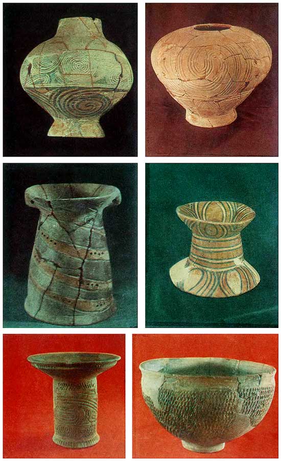 Керамические комплексы рассматриваемого времени включают кухонную посуду с примесью дробленой раковины и песка в тесте и тонкоструктурную расписную посуду без видимых примесей. Первая делится в зависимости от величины зерен примеси на две подгруппы. Посуда с грубой примесью в погребениях не обнаружена. В Поднепровье для захоронения умершего выделывалась специальная керамика, в тесто которой, помимо мелкодробленой раковины, добавляли какую-то выгорающую примесь и охру. Поверхность сосудов с примесью раковины в тесте сглажена и подлощена, а иногда предварительно покрыта коричневым или красным ангобом. Расписная посуда из мелкоструктурной глины желтого или белого цвета также покрывалась ангобом светло-коричневого цвета. Роспись большинства сосудов монохромная, выполнена, как правило, темно-коричневой краской. Красная краска использовалась редко. Как в Причерноморье (табл. LXXVIII, 21, 22, 30), так и в Поднепровье (табл. LXX, 57, 61, 65, 67) по форме сосуды близки керамике предшествующей ступени. Вместе с тем отмечается своеобразие эволюции форм посуды на южных и северных поселениях. Так, в Поднепровье в употребление входят округлотелые горшки (табл. LXX, 56), крынки (табл. LXX, 59, 60), кувшины с крупной ручкой, соединяющей тело сосуда с венчиком (табл. LXX, 65). Заметим, что из числа форм, выделенных В.А. Дергачевым для трех финальных ступеней позднего периода, в этом регионе представлены лишь округлотелые амфоры с ручками по бокам (табл. LXX, 58, 64), а также горшки удлиненных пропорций (табл. LXX, 68). В Причерноморье и Поднестровье в это время распространяются своеобразные резкопрофилированные горшки и миски (табл. LXXVIII, 27, 28). На 10-й ступени позднего периода все чаще используется шнуровой орнамент, сочетающийся с оттисками штампов, наколами, насечками, пальцевыми вдавлениями. На поселениях южного региона орнамент богаче, чем в Поднепровье. Специфически местным является орнаментальный мотив в виде серпа, оттиснутого шнуром (табл. LII; табл. LXXXVII, 5). На расписных амфорах и горшках узор заключен в широкий пояс, на мисках орнамент покрывает всю поверхность с обеих сторон. Наиболее распространены элементы орнамента в виде отрезков прямых и изогнутых лент, сходящихся под углом, овалов, полукругов, фестонов, треугольников. Часто узор сочетается со знаком, напоминающим букву М (табл. XCII, 11).