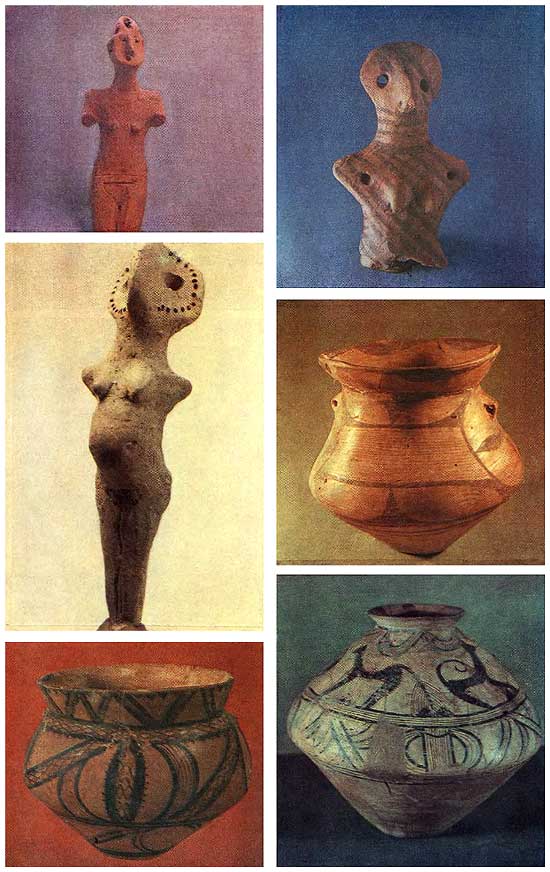 В пластике памятников 10-й ступени позднего периода по-прежнему преобладают женские статуэтки. Фигурки весьма схематичны, имеют пирамидальную или близкую к кубу нижнюю часть, длинную, наклоненную вперед шею, завершающуюся полукруглым выступом – лицом. Головки некоторых статуэток моделированы несколько иначе, причем глаза и нос обозначены штрихами. Статуэтки украшены углубленным узором, включающим знак в виде буквы М (табл. LXXXVII, 8). С ритуальными целями использовались, видимо, и так называемые кубики. Они напоминают нижнюю часть женских фигурок, подобно им орнаментированы с двух сторон, близки им по размерам. «Кубики» сделаны из хорошо промешанной глины без видимых примесей, хорошо обожжены, заглажены. Тесто статуэток представляет собой глину с примесью мелкодробленой раковины.