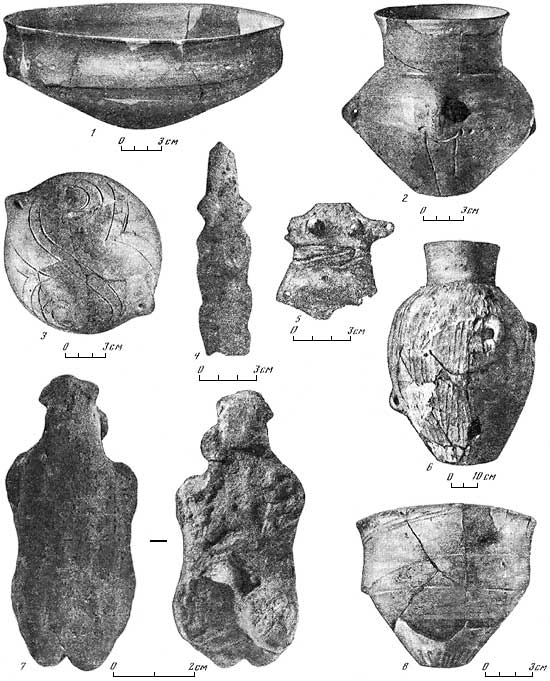 Керамика составляет основную массу находок и на поселениях (табл. XCIII, 1–9, 12). Она изготовлена из отмученной глины с примесью песка. Поверхность сосудов хорошо заглажена, часто залощена. По форме выделяются небольшие чаши с округлым туловом и слегка отогнутым краем и чаши с ребром. Часто они расписаны белой краской после обжига. Наиболее распространенным мотивом росписи являются треугольники, размещенные в шахматном порядке, закрашенные или заштрихованные, причем белые треугольники чередуются с заштрихованными или с неокрашенными. Другие сосуды не расписывались. Это чаши с шаровидным туловом, слегка отогнутым краем и ушками под венчиком; чаши конические или со слегка выпуклыми стенками; чаши с четырьмя выступами над краем; крупные биконические сосуды с двумя слегка загнутыми вверх ручками, расположенными на перегибе стенок.
