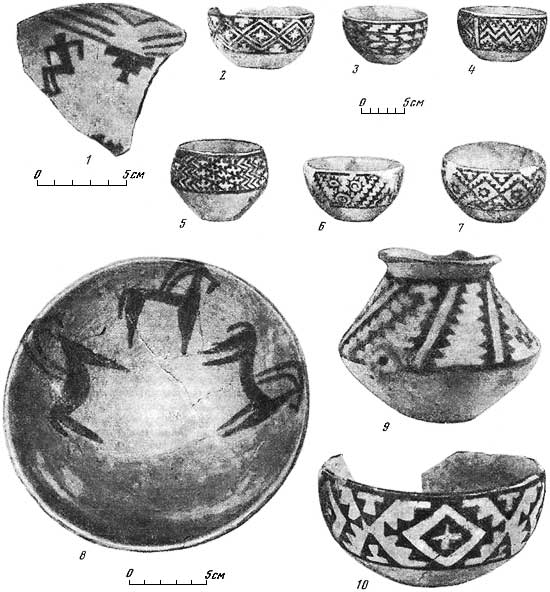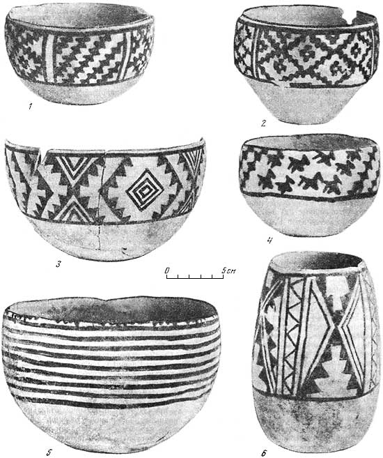 Основные отличия комплекса Кара 1Б как устойчивого набора археологических типов заключаются в керамике, так как пряслица, медные изделия и бусы здесь по существу такие же, как и в слое Кара 1А. Для керамики комплекса Кара 1Б ведущей формой является полусферическая чаша (рис. 3, 1), типичны также биконические чаши, кубки, миски и горшки (табл. XIX, 16–32). Сосуды имеют примесь мелкорубленого самана в тесте, тяжеловесны. Часть из них серого цвета, обычно с лощеной поверхностью, иногда украшенной процарапанным орнаментом. Роспись производилась темно-коричневой краской по зеленовато-белому и много реже – по красному фону. Среди композиций представлены односторонние (1Б, 10Б, 15Б) и двусторонний бордюры (тип. 14). Из элементов композиции распространены многоступенчатые кресты с помещенными внутрь ромбовидными фигурами с различным заполнением, пирамидки из трех и большего числа треугольников, косые зубчатые линии и косые полосы с внутренней горизонтальной штриховкой, перекрещенной одной-двумя вертикальными полосами. Судя по отдельным фрагментам, имеются изображения козлов и птиц, правда, сравнительно редкие, а изображения пятнистых животных, столь характерные для керамики Кара 1А, отсутствуют.