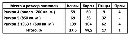 Специфической особенностью рассматриваемого керамического комплекса являются зооморфные мотивы росписи. Это изображения козлов, причем отмечается три их варианта. Первый – профильные изображения животного с бородой, резко загнутыми рогами и длинным хвостом, нередко создающим впечатление трехногой фигуры. Степень схематизации этих рисунков различна, но в основном они весьма реалистичны. Ко второму варианту относятся профильные изображения животных с прямой спиной и сравнительно коротким, опущенным вниз хвостом, что придает фигуре прямоугольные очертания. Особняком стоит изображение кормящей козы с Чонгдепе с поднятым вверх хвостом. Третий, крайне редкий вариант представляет собой изображение козла, воспроизводящее все четыре ноги в противовес профильной манере, что скорее всего является данью среднеэнеолитическим традициям. Количественно преобладают рисунки пятнистых животных, которых, учитывая генетический аспект и ряд специфических деталей, можно считать барсами, хотя чаще всего они сильно схематизированы. Большинство рисунков передает спину животного плавной скругленной линией, реже фигура имеет геометризированные очертания. Хвост обычно длинный, изгибается вдоль туловища, ноги имеют на конце три отростка (когти?). Голова животного, как правило, не выделена, две черточки или два треугольника изображают уши, такими же треугольниками или усиками переданы челюсти. Довольно часты изображения птиц. Они, как и фигуры козлов, силуэтные, в основном встречаются в сочетании с солярными кругами. Редкие фигуры орлов также даны в профиль, в геральдической позе, с распростертыми крыльями. Кроме того, имеются изображения различных трудно отождествляемых существ типа птица-козел (Массон В.М., 1960б, табл. XXI, 4). Интересно распределение фрагментов керамики с зооморфными изображениями по раскопам (табл. 4).