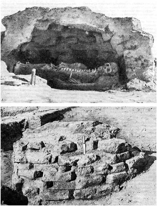 Особый интерес представляют коллективные гробницы Геоксюра 1 (рис. 6, 1–2), раскапывавшиеся В.И. Сарианиди в течение нескольких полевых сезонов. Они, как правило, овальные в плане, реже – эллиптические или прямоугольные, возведены из сырцового кирпича и имеют размеры от 2,5×2,3 м до 2,2×1,9 м. Перекрытие из того же сырцового кирпича ложносводчатое; в отдельных случаях прослежен вход в камеру, располагавшийся сбоку и при каждом захоронении закладывавшийся вновь. Захоронения в камерах совершались последовательно, причем останки ранее помещенных в гробницу отодвигались в сторону, образуя груду перемешанных костей, среди которых правильное анатомическое расположение сохранял лишь скелет усопшего, помещенного в гробницу последним. Число погребенных в могиле колеблется от 2 до 10–12, но, как правило, больше 2. Инвентарь в большинстве случаев или вообще отсутствует, или очень беден и представлен одиночными каменными или расписными сосудами, плетеными корзинами (сохранились только отпечатки), медными булавками с лопаточковидными навершиями, гипсовыми и каменными бусинами. Выделяются погребение 116 гробницы X, в котором находились медное зеркало в плетеном футляре, медная палочка и бусы (Сарианиди В.И., 1965а, с. 104), и ряд вскрытых в 1965 г. погребений, где, помимо керамики, гипсовых бус и каменных сосудов, имелись оригинальный четырехугольный расписной сосуд и гипсовые, обтянутые золотой фольгой бусы (Сарианиди В.И., 1966, с. 70).