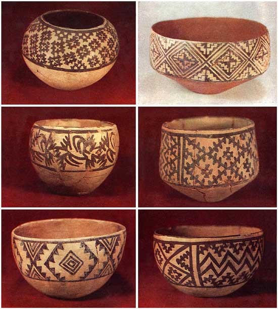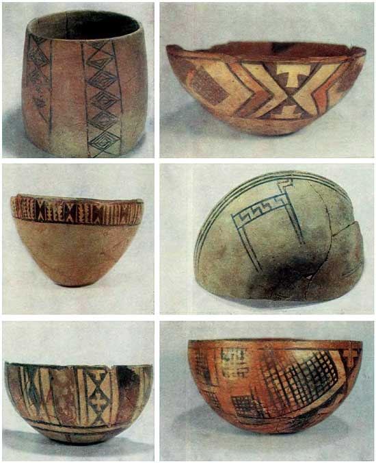 Расписные сосуды позднеэнеолитических памятников Средней Азии (Карадепе, верхний справа – Алтындепе).