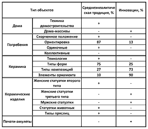 Рассмотрим имеющиеся позднеэнеолитические материалы именно с генетических позиций, выделяя два показателя: типы объектов, имеющие прямую связь с местной среднеэнеолитической традицией, и типы объектов, которые можно рассматривать как инновации. По технике домостроительства, технологии изготовления керамики, уровню металлургии, широко использующей медное литье, позднеэнеолитические комплексы прямым образом связаны с достижениями предшествующего периода и отличаются лишь отдельными усовершенствованиями, не выходящими за рамки генетического развития. Иную картину мы наблюдаем в материалах, свидетельствующих о соотношении культурных традиций и инноваций (табл. 6).