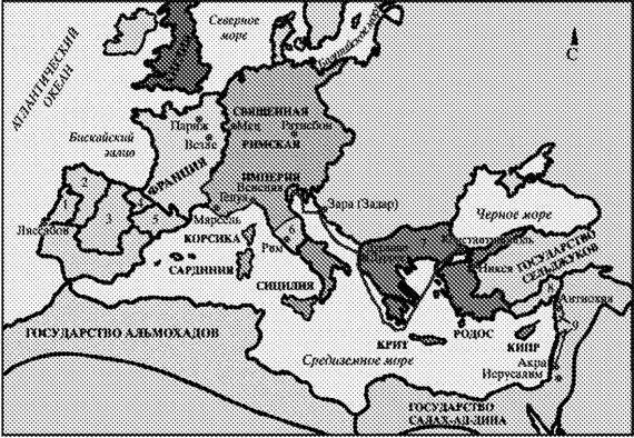 1 – Португалия, 2 – Леон, 3 – Кастилия, 4 – Наварра, 5 – Арагон, 6 – Папская область, 7 – Византийская империя, 8 – Киликийское армянское государство, 9 – Христианские государства
