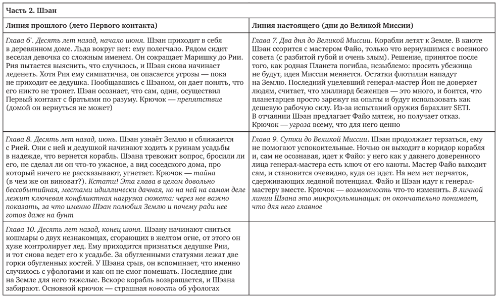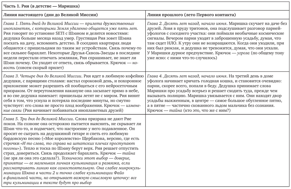• Приняв такое решение, я столкнулась с проблемой: как все-таки пораньше пояснить читателю, откуда пришельцы вообще взялись, а то ведь это утомительно – долго ничего не понимать. Разжевывать в духе «10 лет назад первый корабль упал недалеко от нашей дачи»? Фу. Лучше покажу. Так пришла идея сочетать кусочки от лица взрослой Рии – и ее же маленькой. Открывающим эпизодом параллельной линии – прошлого – я выбрала милую дачную зарисовку (какую – ниже в таблице).