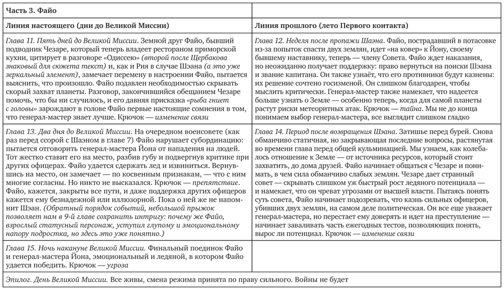 • Неплохо. Но также я уже понимала, что хочу максимально деконструировать сюжетные тропы (если вдруг вам незнакомо это понятие, можно нырнуть в главу 13), искать пусть менее яркие, но более реалистичные решения. Например, я осознавала, что межпланетной войны в моей книге не будет, «Марс атакует!» – до сих пор мой кошмар. Но угроза, вот эта тень войны, которая прошла по касательной, – важна. А значит, если всю историю расскажет Рия, ярко поделиться ужасом («Ну вообще-то пришельцы летели не дружить, а нападать, но у них прямо по дороге произошел переворот!») я бы не смогла. Читатель бы все узнал постфактум, когда герои встретились бы. А может, и не узнал бы, Шэан не болтлив.