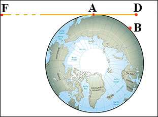 Возьмём рядом с поверхностью Солнца точку F. От неё солнечный луч до точки A проходит за 500 секунд (рисунок выше). Солнечная волна, пройдя точку F, достигнет в точке касания (A) одновременно и точек B и D. Они окажутся там за 500 секунд своего движения навстречу лучу. У нас 2 типа объектов. Один – неподвижный (место касания A, которое одновременно является и неподвижной относительно Земли расчётной точкой) и 2 двигающихся (B и D). B – наблюдатель на вращающейся поверхности Земли, и D – летящий к земной поверхности метеорит. Выберем ситуацию, когда в момент начала движения солнечной волны все четыре точки (F, A, B и D) находятся практически на одной прямой (в отличие от рисунка, но он – лишь схема для объяснения). Учитывая большой диаметр Земли и малый период (500 секунд), таких ситуаций (не только на Земном Шаре) – бесчисленное множество. Для определения скорости света надо знать проходимое волной расстояние.
