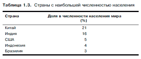 На долю пяти самых богатых стран мира приходится около 60 % мирового ВВП (рис. 1.8). Почти половина населения мира проживает в пяти самых многонаселенных странах.