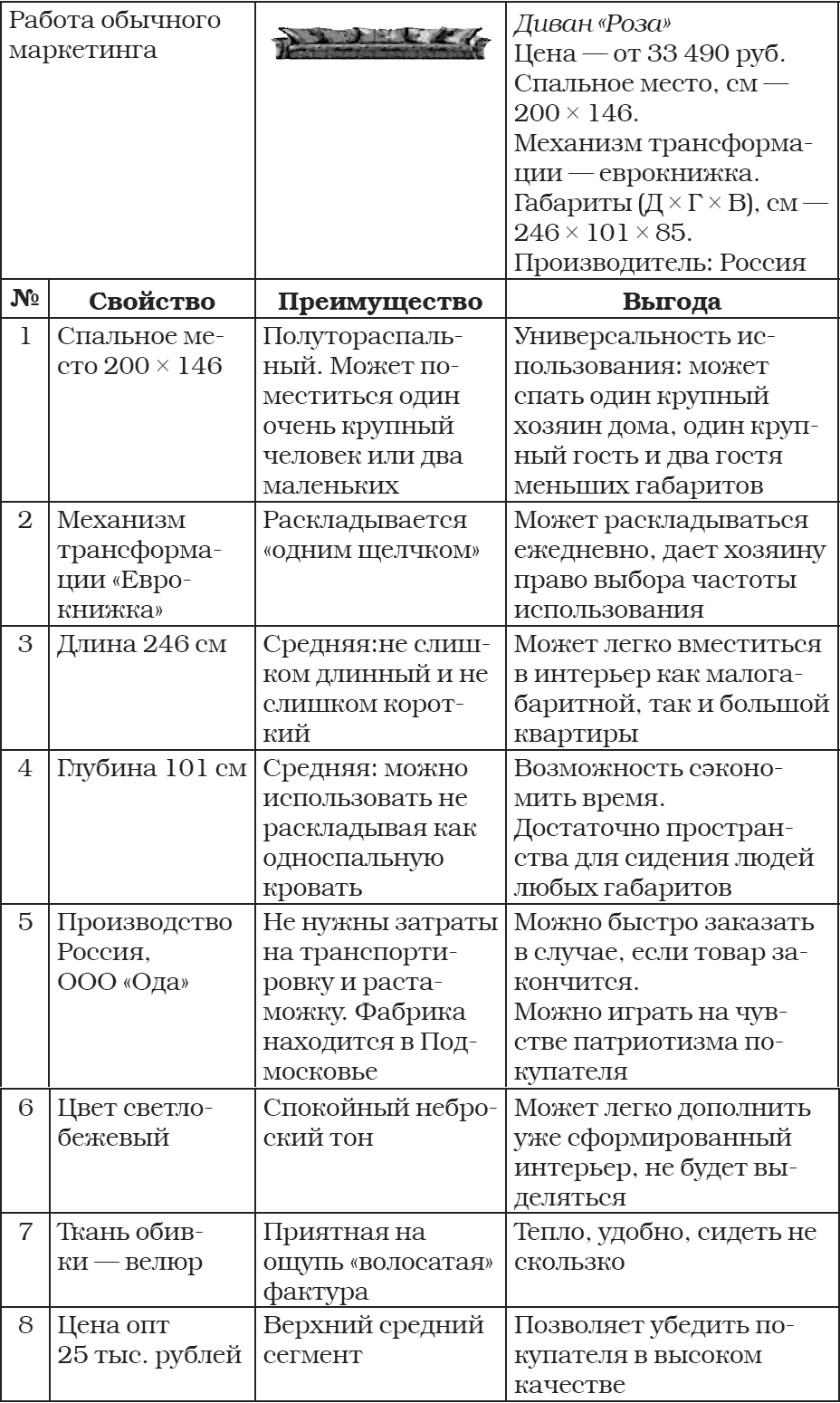 Давайте попытаемся продать по системе «Свойства – Преимущества – Выгоды» всем хорошо знакомый вид продукции, не требующий от торгового представителя специального образования, – диван. Мы воспроизведем наиболее распространенный механизм продажи, который имеет место в компаниях с обычным маркетингом. Предположим, продвигаемый нами диван обладает следующими свойствами.
