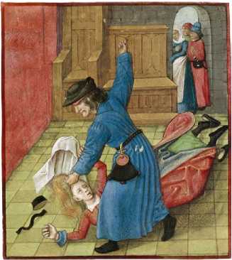 Ревнивый муж бьет женуМиниатюра из «Романа о Розе». Ок. 1490–1500 г.