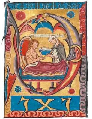 Женщина кормит больного проказой Миниатюра из псалтыря конца XIII в.