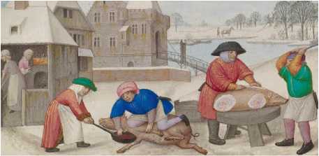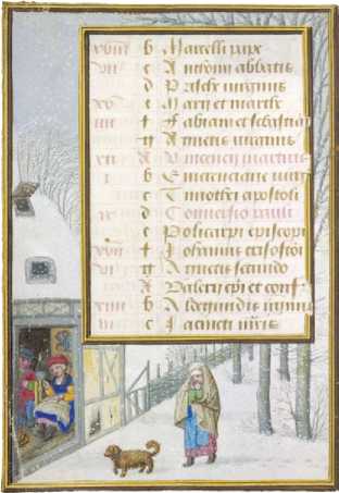 Январь отводился под праздники, учитывая суровую погоду, не располагавшую к полевым работам. На этот месяц приходились и большинство дат христианского литургического календаря, хотя даже в дни праздников кто– то должен был таскать дрова для очага, а также кормить и ухаживать за домашними животными. Картины февраля чаще всего изображают, как крестьяне согреваются у очага, продрогшие