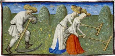 Здесь женщин обычно можно воспринимать как помощниц и напарниц мужчин, за исключением сцен, где они все вместе работают на богатых. Но даже если женщины регулярно появляются в календарных циклах «Времена года», в сценах, где изображен всего один работник, им неизменно бывает мужчина. Причина в том, что эти иллюстрации отражали идеализированные представления о сельском труде, в котором главной рабочей силой всегда был мужчина, а женщины не соответствовали стереотипному или архетипическому образу крестьянина, неважно, сколько бы сена они ни застоговали и сколько бы овечьей шерсти ни настригли. Женщина воспринималась просто как приложение к мужчине.