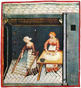 таким же привычным и повсеместным для средневековых женщин занятием, как стирка, было и изготовление тканей, многие из них умели прясть и ткать. Чтобы переработать состриженную шерсть в пряжу или нить, сначала ее требовалось прочесать, для чего ее пропускали через две большие чесалки, которые удаляли с шерсти сор и грязь и заодно распрямляли волокна, чтобы облегчить получение пряжи или нити. Если нужна была цветная нить или пряжа, шерсть на этом этапе окрашивали. Средневековые люди были неравнодушны